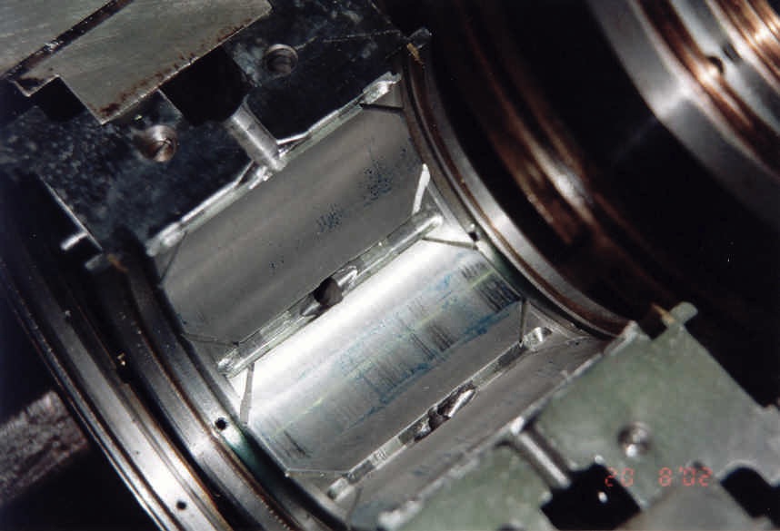 HD-Läufer einer Entnahme-Kondensationsturbine, Folgen eines Wasserschlages, erkennbar die gespülten Schaufelreihen nach der Entnahmestelle, vor der Entnahmestelle alle Schaufeln noch mit Belägen versehen
