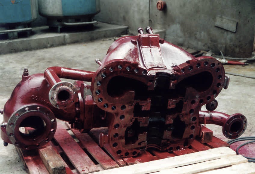 Feststellung des Schadensumfangs und der Schadensursache an einer Franco Tosi Dampfturbine 11,8 MW Nach dem Aufdeckeln erkennbare Erosionsspuren der letzten Schaufelreihe im ND-Teil